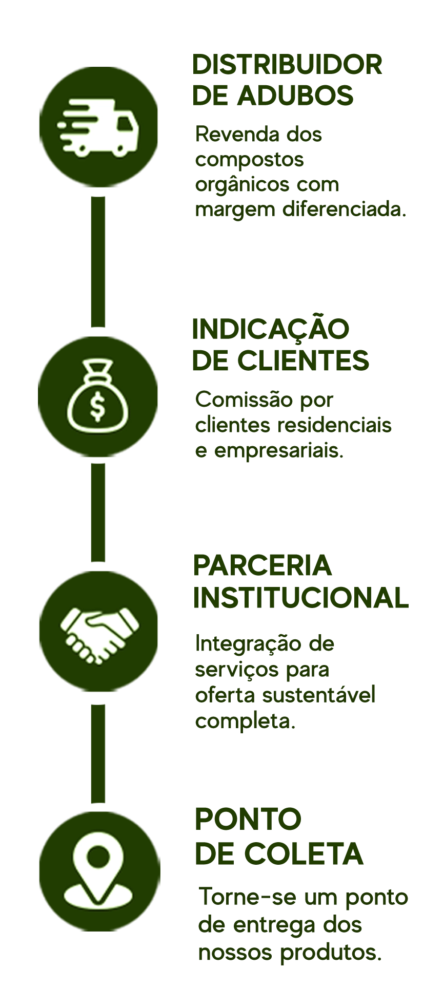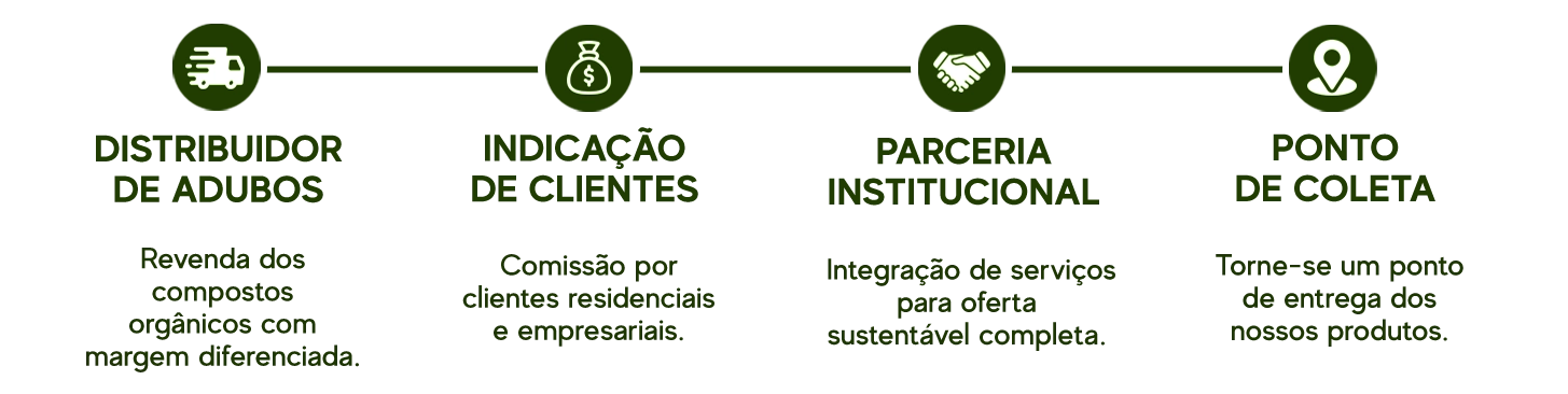 Seja um distribuidor dos nossos adubos ou indique clientes. Oportunidades de parceria para fortalecer a economia circular.